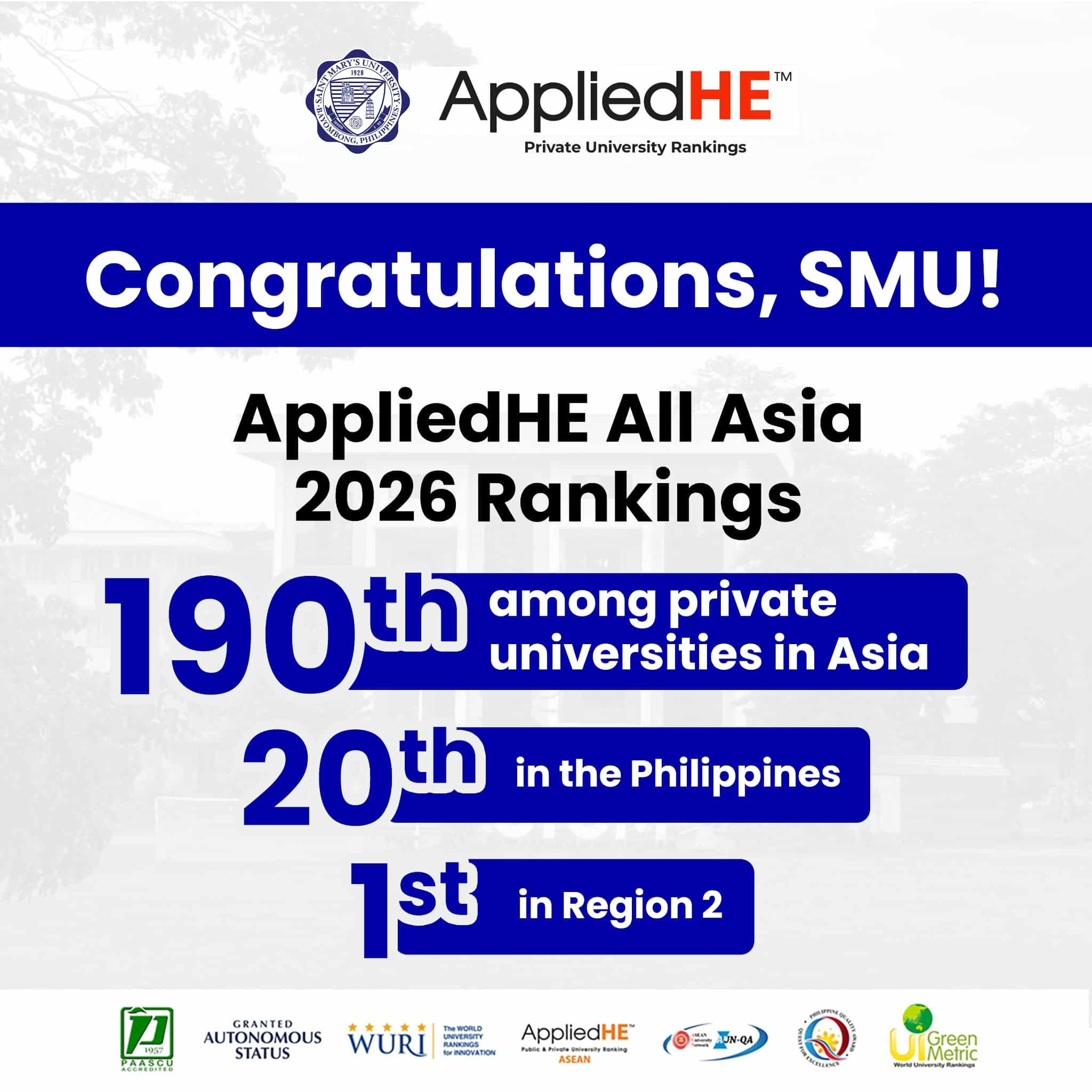 Saint Mary’s University (SMU) has reaffirmed its position as one of Region 2’s leading private higher education institutions after earning impressive distinctions in the AppliedHE All Asia 2026 Rankings, a respected independent assessment of universities across Asia.