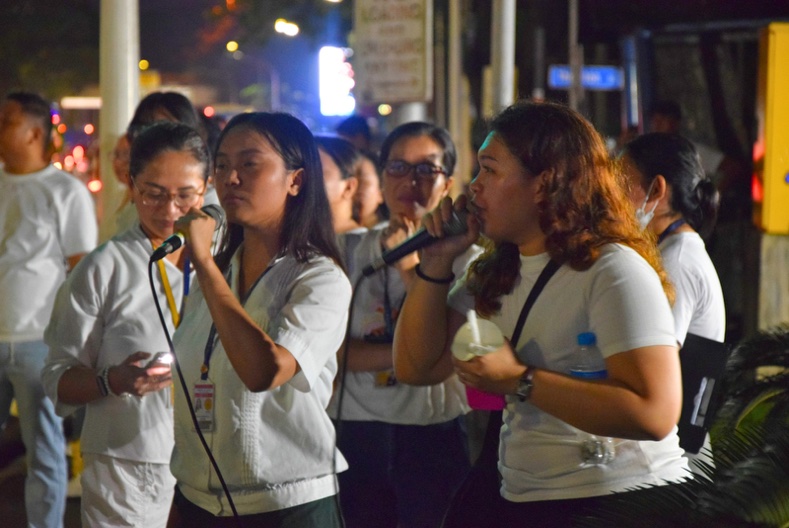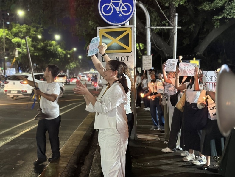 As dusk settled, Katipunan Avenue in front of Miriam College’s Gate 1 was illuminated by candles and filled with the sound of prayer as the community prayed the Rosary together. The solemn moment was followed by the Noise Barrage, where participants invited motorists and pedestrians to join them in making noise for integrity and justice. With chants like “Busina, busina, para sa korap!” Katipunan avenue came alive with the sound of car horns and voices, expressing the community’s shared call for truth and accountability.